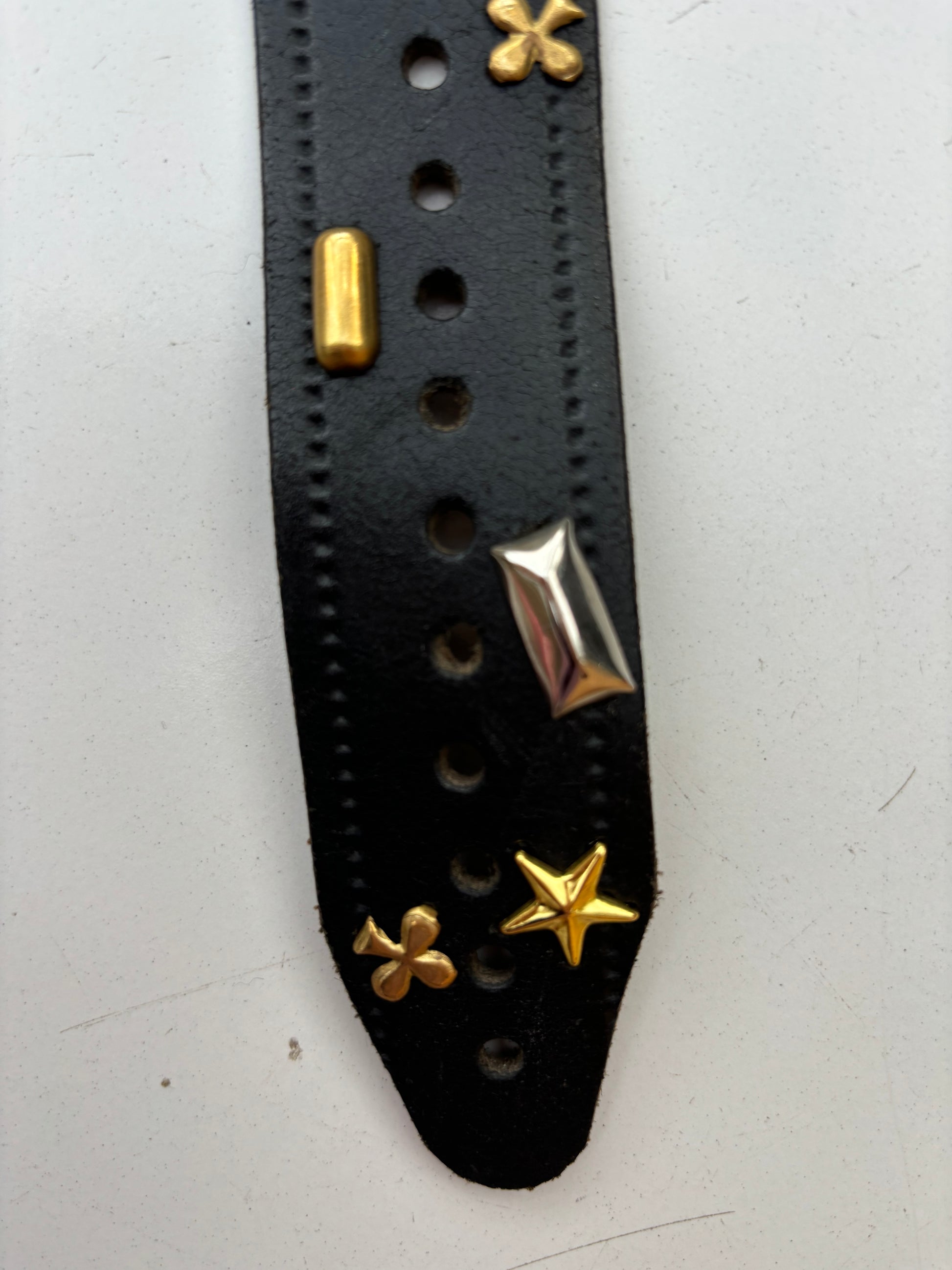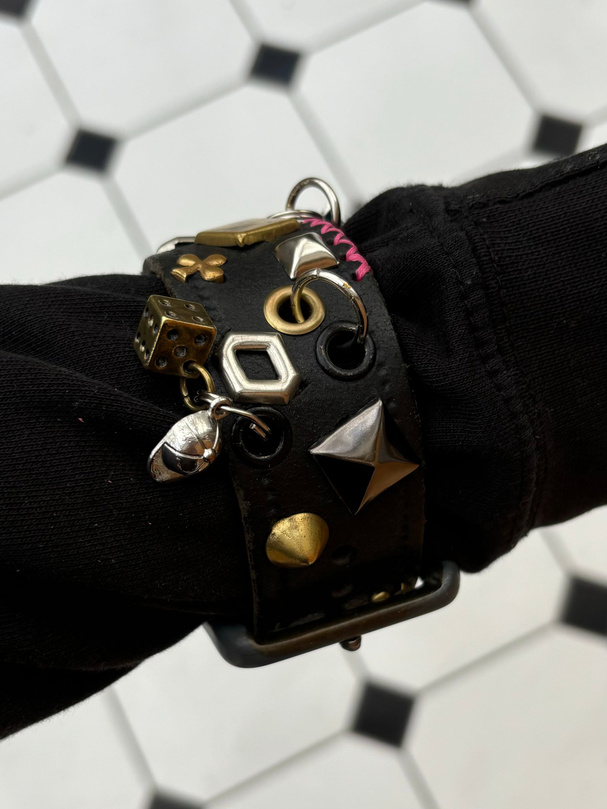 A handcrafted bracelet made from scavenged vintage leather belts, buckles, and found metal bits- each one completely unrepeatable. These are the remnants of old lives: worn leather with its own patina, hardware that clinks and jangles, charms salvaged over time. Every Beltlet is constructed in London from materials hunted down at car boot sales, flea markets, and forgotten corners. Once it's sold, it's gone forever.